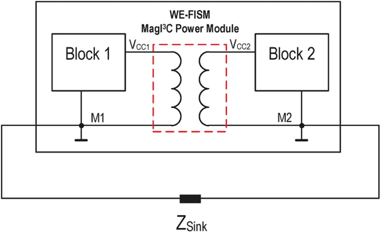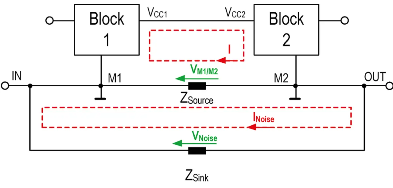 Erst wenn die beiden Masseknoten M1 und M2 durch eine zusätzliche Verbindung miteinander verbunden werden, kann ein Störstrom fließen. Dieser erzeugt wiederum an der Leitungsimpedanz ZSenke einen Spannungsabfall – was wiederum zu Gleichtaktstörungen führt. Eine zusätzliche Verbindung entsteht z.B. dadurch dass ein weiterer Schaltungsteil wie in Abbildung 2 dargestellt mit seiner Massestruktur der bestehenden Massestruktur eingefügt wird.