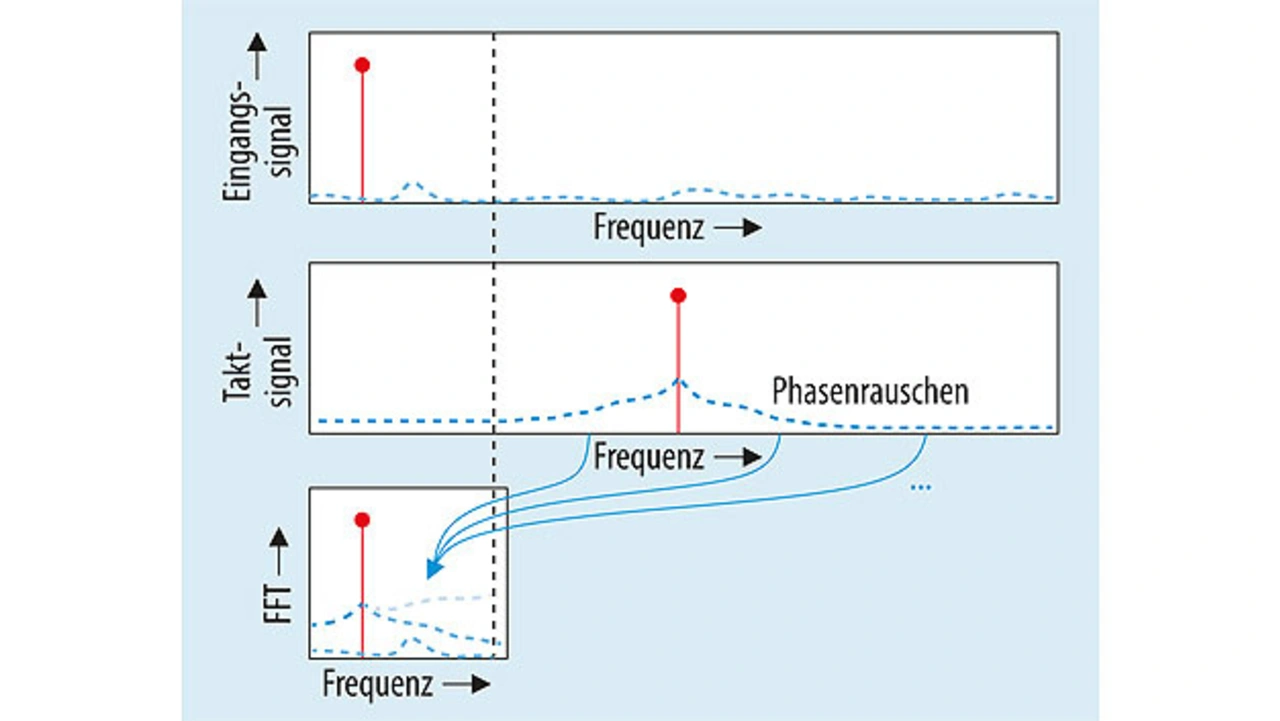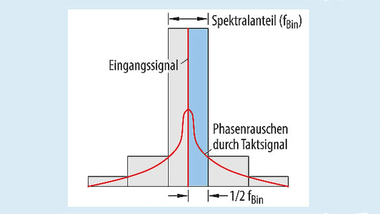 Wenn eine große Amplitude AE digitalisiert wird, wird daraus durch die FFT ein frequenzmoduliertes Spektrum, mit AE als Träger und die Takt-Seitenbänder repräsentieren das Signal. Hier ist zu beachten, dass das Phasenrauschen in der FFT nicht bandbegrenzt ist und das Rauschen mehrfach für Komponenten in den Seitenbändern sorgt (html?aid=167084" href="https://www.elektroniknet.de/elektronik/halbleiter/bilder/taktgenerierung-fuer-sigma-delta-adus-mehr-als-nur-jitter-8322-Bild-5.html?aid=167084">Bild 5).
