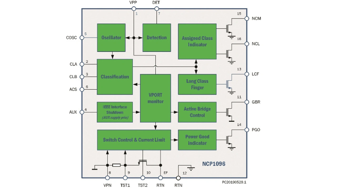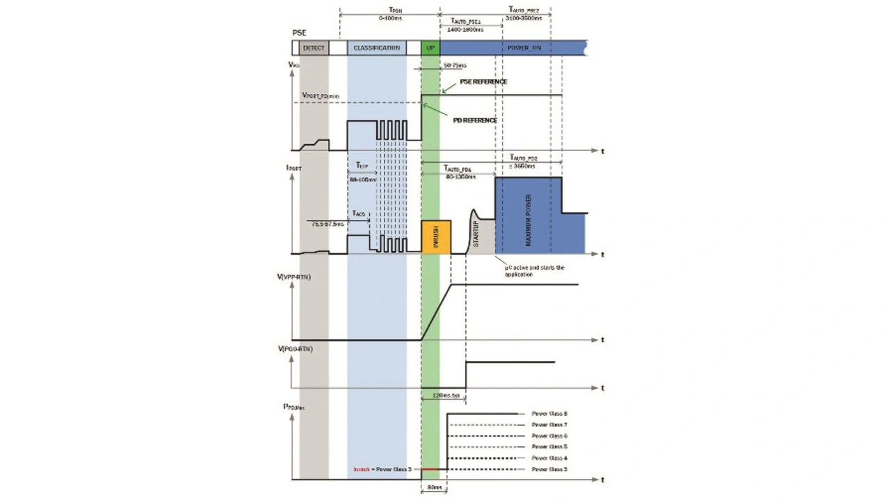 Der PoE-PD-Schnittstellen-Controller NCP1095 von ON Semiconductor unterstützt IEEE 802.3af, 802.3at und 802.3bt. Er integriert alle Funktionen, um ein PoE-PD zu realisieren, beispielsweise Erkennung, Klassifizierung und Strombegrenzung während der Einschaltphase (Bild 2). Die Stromversorgung erfolgt über einen externen Durchgangstransistor, und der Controller verfügt über einen Power-Good-Pin, um den nachgeschalteten DC-DC-Hauptwandlers ein- oder abzuschalten. Über einen Pin für das Klassifizierungsergebnis kann der Controller eine bestimmte Leistungsklasse bis zur Klasse 8 unterstützen.