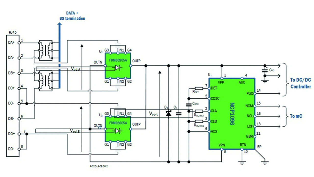 Der NCP1095 unterstützt die Autoclass-Funktion und zeigt an, wann eine kurze Maintain-Power-Signatur implementiert werden kann. Darüber hinaus lässt sich mit einem Pin, der eine Hilfsversorgung erkennt, der Baustein in Anwendungen einsetzen, in denen die Stromversorgung entweder über PoE oder über ein Steckernetzteil erfolgen kann. Bild 3 beschreibt, wie sich eine PoE-PD-Anwendung mit dem NCP1095 oder NCP1096 (mit integriertem Schalttransistor) implementieren lässt.