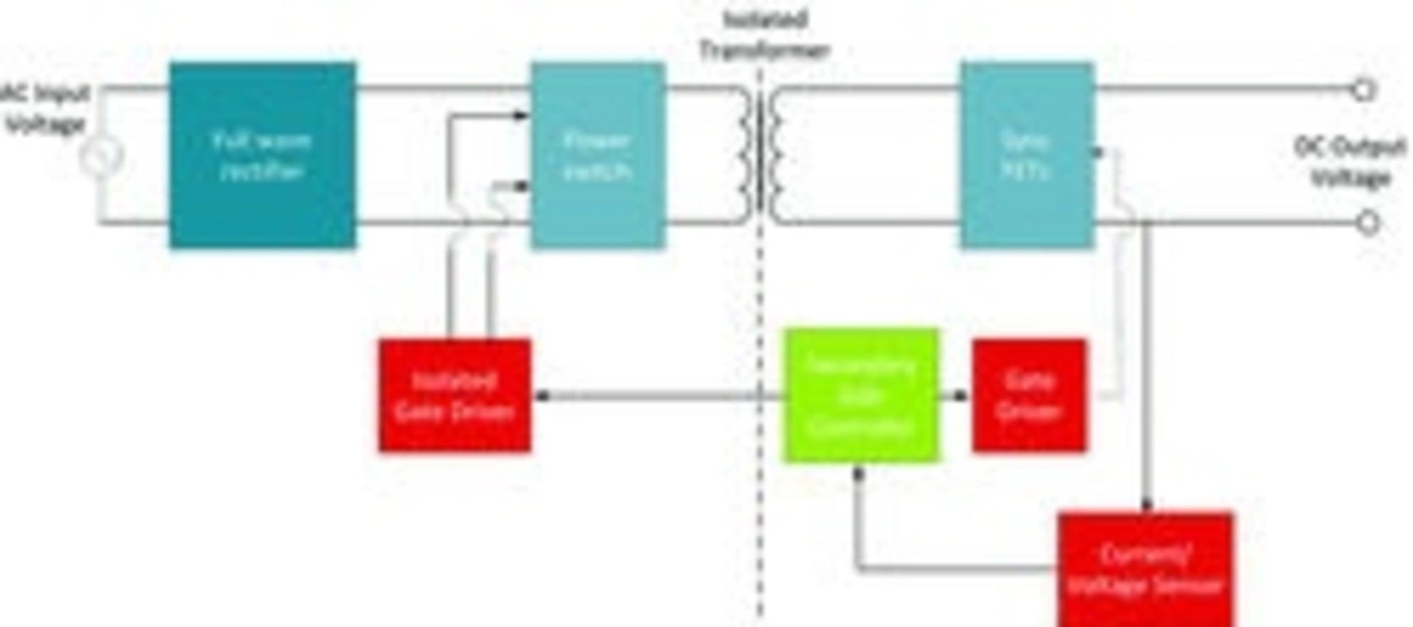 Bild 1 zeigt das typische Blockdiagramm eines Schaltnetzteils. Die eingangsseitige Wechselspannung wird zunächst gleichgerichtet (Full Wave Rectifier). Diese Zwischenkreisspannung wird dann durch die Leistungsschalter (Power Switch) moduliert, angesteuert von isolierten Gate-Treibern. Diese wiederum erhalten das Ansteuersignal vom sekundärseitigen Controller. Der Transformator trennt Eingangs- und Ausgangsseite und transformiert die Spannung über das Windungsverhältnis. Auf der Sekundärseite richten sogenannte Synchron-FETs, die wie Dioden arbeiten, die transformierte Wechselspannung wieder gleich. Auch die Sync-FETs benötigen Gate-Treiber zur Steuerung ihres Schaltens. Strom- und/oder Spannungssensoren überwachen den Ausgang und sorgen für eine Rückkopplung an den Controller zur Feinabstimmung des Modulationsverfahrens auf maximale Performance.