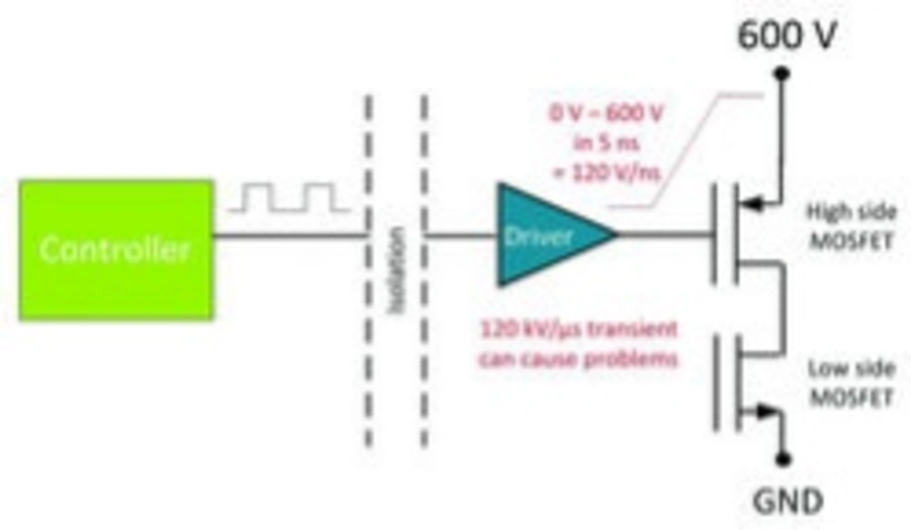 Gate-Treiber, welche die Leistungsschalter steuern, müssen so ausgelegt sein, dass sie diese Gleichtakt-Störtransienten aushalten, ohne Glitches oder Latch-up-Effekte hervorzurufen. Diese Fähigkeit wird in den meisten Produktdatenblättern als »Common Mode Transient Immunity« (CMTI) angegeben. Im Beispiel Bild 2 sollte die CMTI des Gate-Treibers mindestens 120 kV/µs betragen.