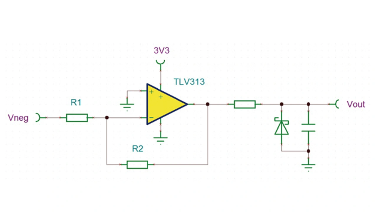 Eine zweite Möglichkeit zum Abtasten negativer Spannungen wird in Bild 2 gezeigt. Es handelt sich um einen einfachen invertierenden Verstärker mit einer Verstärkung von Uout/Uneg = –R2/R1. Der invertierende Verstärker hält seinen negativen Eingang auf der gleichen Spannung wie der nichtinvertierende Eingang, der 0 V beträgt. Daher wird nur eine einzige, positive Versorgungsspannung für den Operationsverstärker benötigt. Die negative Eingangsspannung Uneg wird zu einem positiven Ausgang Uout invertiert.