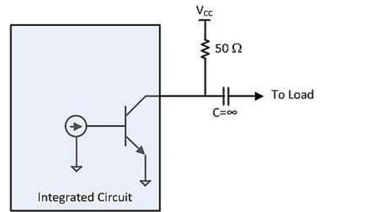 Das Prinzip eines solchen Open-Collector-Ausgangs besteht darin, dass ein Transistor einen Strom durch einen Widerstand oder eine Induktivität steuert, der bzw. die mit einer höheren Spannung verbunden ist.