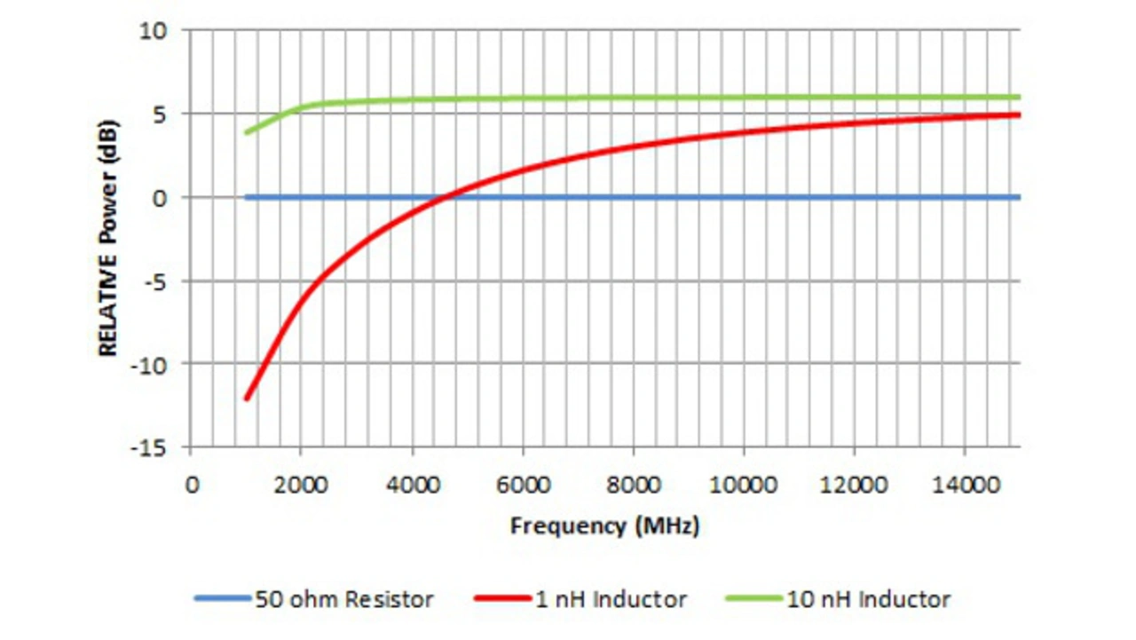 Bei höheren Frequenzen ist deshalb die Verwendung einer Induktivität anstatt eines Widerstands zu empfehlen, denn mit ihr lässt sich eine erhöhte Impedanz erzielen, ohne dass eine DC-Differenzspannung entsteht. Bild 3 illustriert die Verwendung von Gleichung 1 zum Berechnen der relativen Leistungen wenn am Kollektor der Schaltung aus Bild 1 ein Widerstand mit 50 Ω, eine Induktivität mit 1 nH und eine Induktivität mit 10 nH verwendet wird.