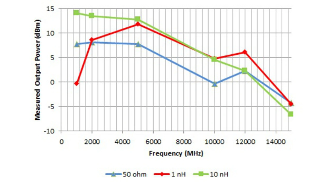 Aus Bild 3 geht hervor, dass eine Induktivität am Kollektor bei Frequenzen über 4,5 GHz eine höhere Ausgangsleistung ergibt als ein 50-Ω-Widerstand. Sofern die Frequenz oder der Induktivitätswert hinreichend hoch ist, kann die Steigerung der Ausgangsleistung theoretisch bis zu 6 dB betragen.