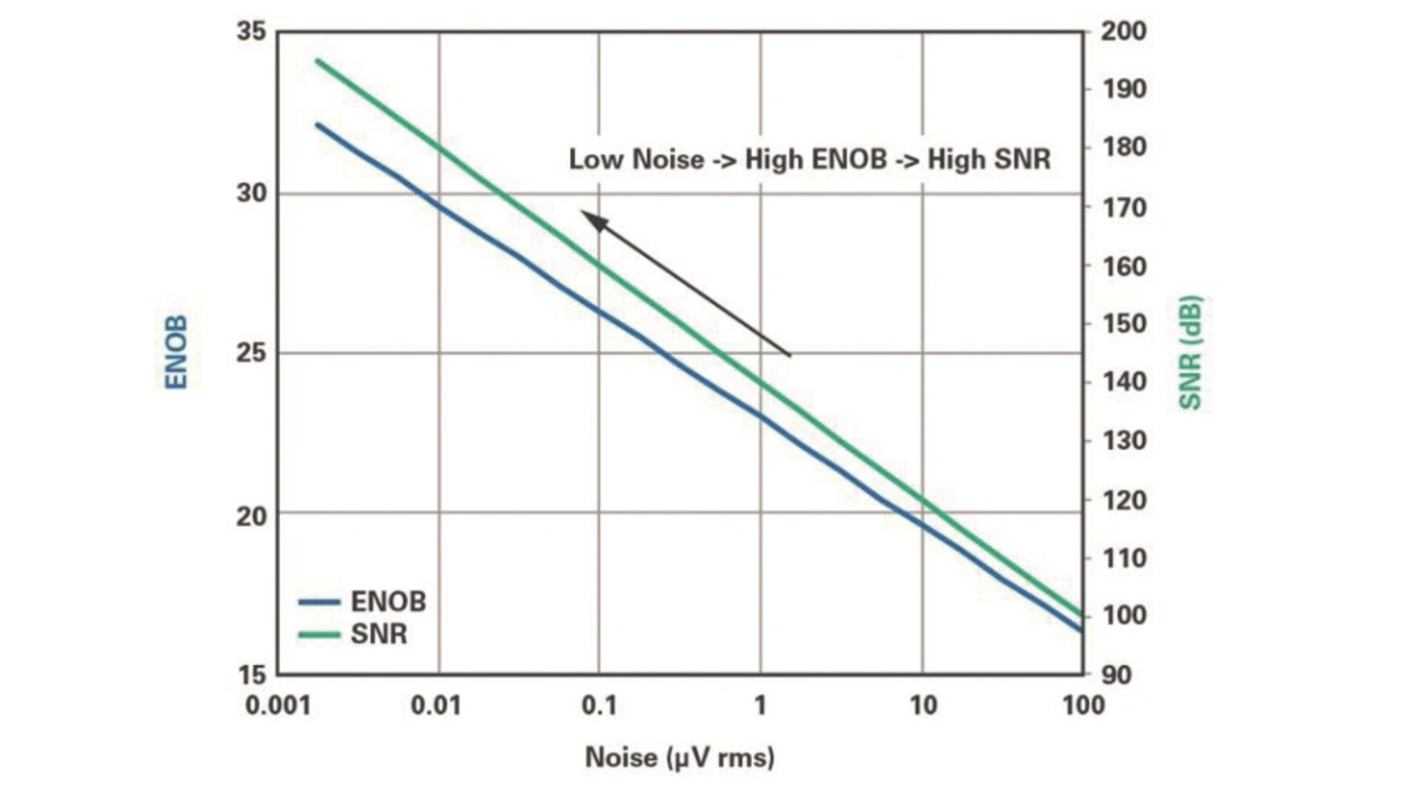 Um eine derart hohe Auflösung zu erreichen, muss das Rauschen in der gesamten Signalkette außergewöhnlich niedrig sein. Bild 1 zeigt, wie sich das Rauschen in Abhängigkeit von der effektiven Anzahl der Bits (Effective Number Of Bits; ENOB) und dem Signal-Rausch-Verhältnis (Signal to Noise Ratio; SNR) darstellt. Dabei errechnet sich das Rauschen auf Basis einer Referenzspannung VREF von 5 V und eines ADC-Eingangs, der auf den vollen Skalenbereich eingestellt ist. Um eine Auflösung von 25 Bit oder einen Dynamikbereich von 152 dB zu erreichen, darf der Effektivwert für das Systemrauschen daher höchstens 0,2437 µV betragen.
