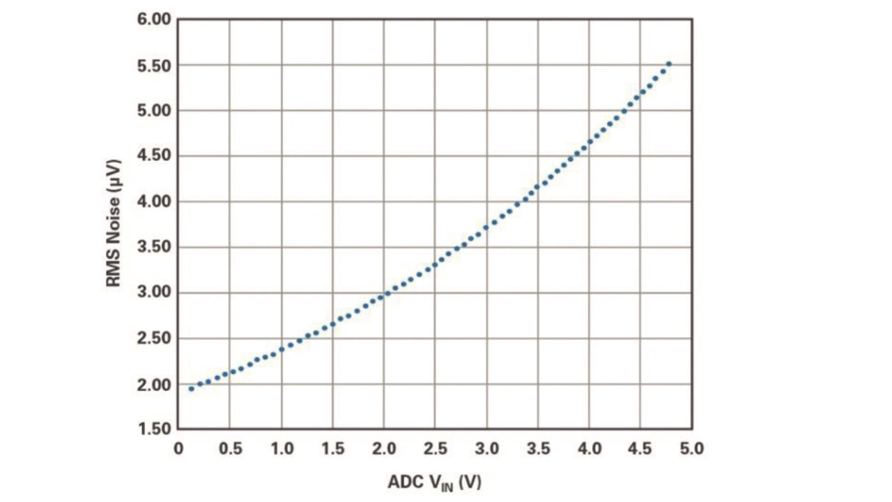 Um die Auswirkungen des Rauschens der Spannungsreferenz auf das Gesamt-rauschen des Systems zu untersuchen, zeigt Bild 2 die Beziehung zwischen dem gesamten Systemrauschen (Effektivwert) und der Gleichspannung am ADC-Eingang. Für diesen Test verwendeten wir den 32-Bit-ADC AD7177-2, wobei dessen VREF-Eingang an den LTC6655-5 (5 V) und dessen ADC-Eingang an eine rauscharme Gleichspannungsquelle angeschlossen war. Die ausgangsseitige Datenrate des ADCs war auf 10 kSPS (Kilo-Sample per Second) eingestellt.