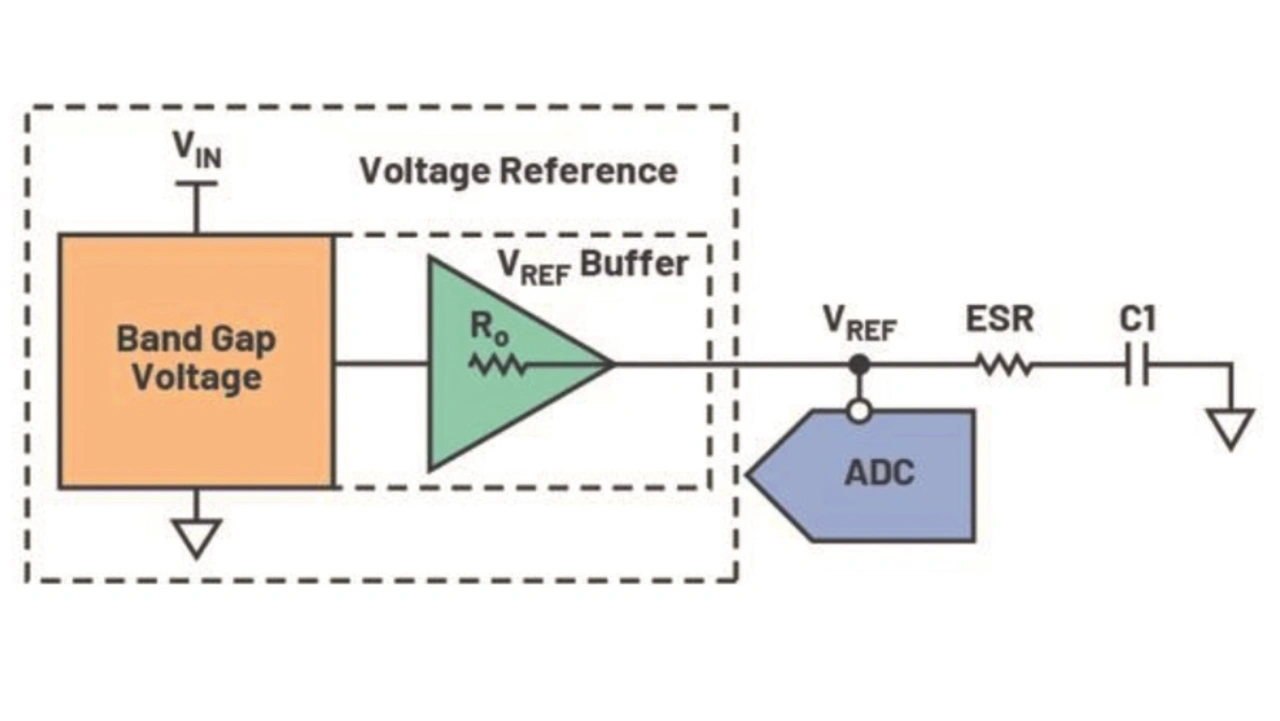 Bild 3 zeigt eine Spannungsreferenz, die einen ADC über einen Tiefpassfilter versorgt. Dieser besteht aus einem externen Speicherkondensator C1, dessen äquivalenten Serienwiderstand (ESR) und der Ausgangsimpedanz eines Pufferverstärkers R0 für die Spannungsreferenz. Die Eckfrequenz des passiven RC-Tiefpasses bestimmt sich durch