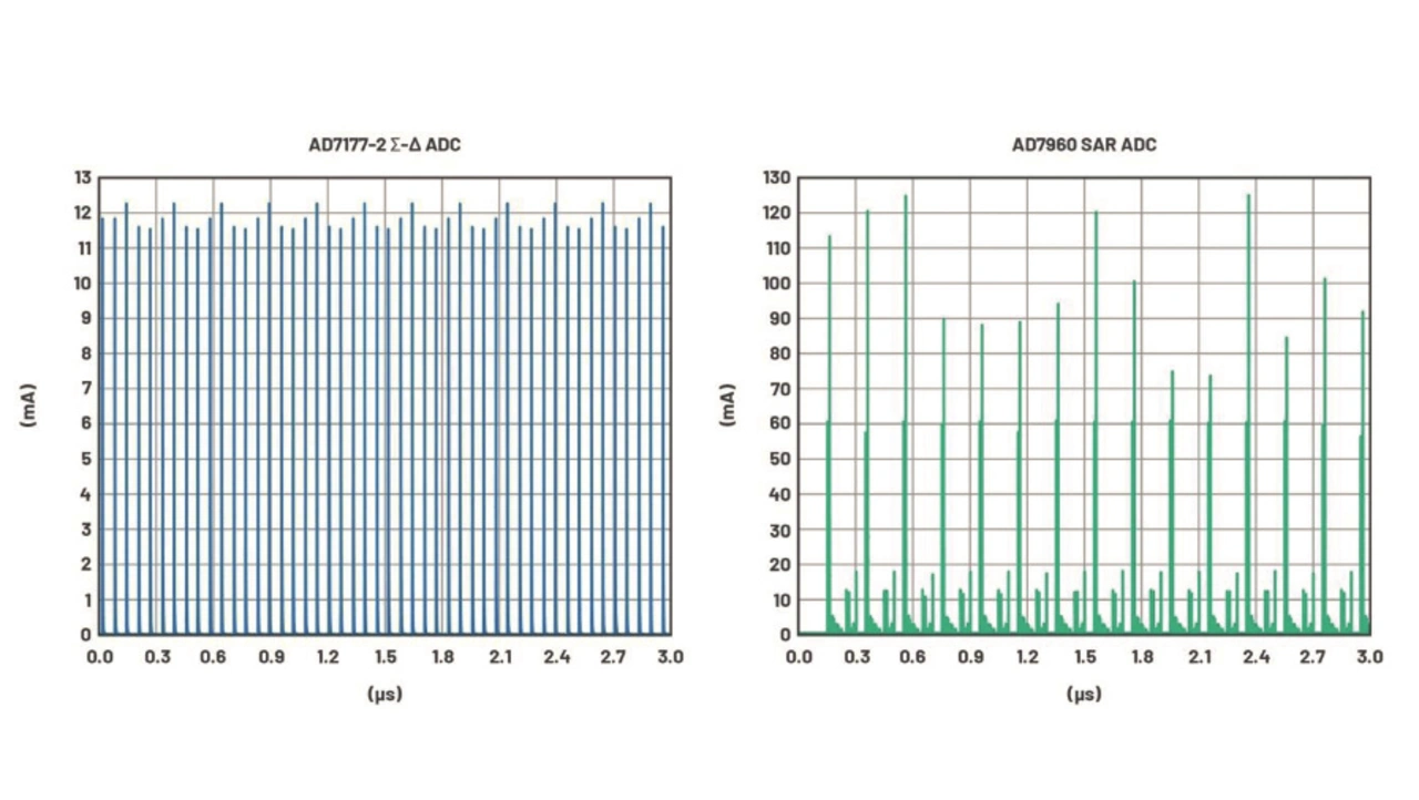Der Kondensator C1 wirkt auch als lokaler Energiespeicher, um Spannungsspitzen zu glätten. Diese können entstehen, wenn die Spannungsreferenzschaltung des ADCs plötzlich den Laststrom ändert. Bild 4 zeigt das dynamische Verhalten des Referenzstroms des Sigma-Delta-ADCs AD7177-2 und des SAR-ADCs (Successive Approximation Register) AD7980.