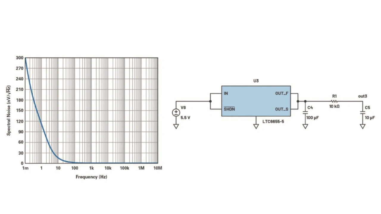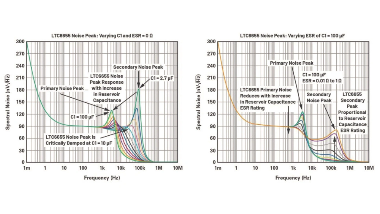Zwar dämpft der äquivalente Serienwiderstand ESR von C1 die primäre Störspitze, führt aber eine sekundäre Störspitze bei 100 kHz und darüber ein. Dies lässt sich dadurch erklären, dass der ESR des Kondensators eine Nullstelle einfügt, wodurch sich die Phasenreserve vergrößert und die primäre Störspitze reduziert wird. Allerdings verbindet sich diese Nullstelle mit der inhärenten Nullstelle des LTC6655 und erzeugt eine sekundäre Störspitze. (Wichtig: Das Rauschverhalten in Bild 5 ist einzig und allein für den LTC6655 gültig.)