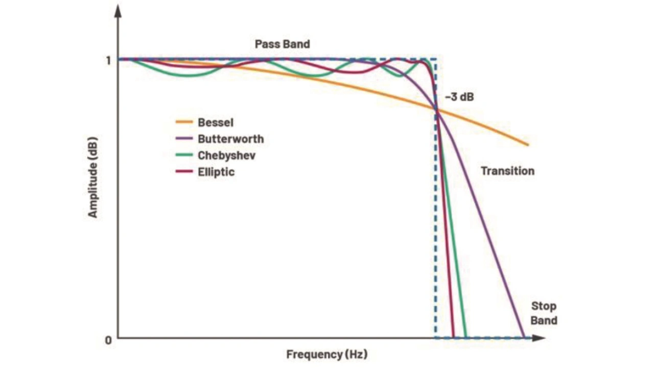 Es gibt mehrere verschiedene Arten von aktiven Tiefpassfiltern, z. B. Bessel-, Butterworth-, Tschebyscheff- und elliptische Filter (Bild 8). Ein flacher Bandpass ohne Welligkeit beeinträchtigt die DC-Genauigkeit der Präzisions-Spannungsreferenz nur minimal. Von allen Filtertypen kann ein Tiefpass auf der Grundlage der Butterworth-Topologie einen flachen Bandpass und eine hohe Dämpfung erreichen.