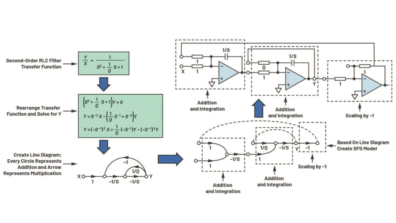 Bild 9 zeigt ein Beispiel für einen Tiefpassfilter zweiter Ordnung, der mithilfe der SFG-Methode von der Übertragungsfunktion zu Schaltungsblöcken übergeht. Der Skalierungswiderstand R und der Kondensator C werden für die Eckfrequenz konfiguriert: