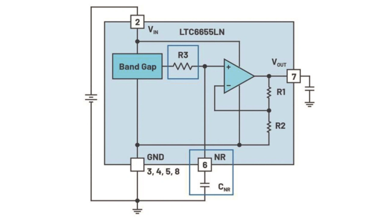Der LTC6655LN nutzt die Vorteile dieser Architektur. Er besitzt einen Pin zur Rauschunterdrückung, um das Breitbandrauschen zu reduzieren, sowie einen integrierten Ausgangspuffer. Auch enthält er einen internen Widerstand R3 und kann mithilfe eines externen Kondensators am Rauschunterdrückungsanschluss NR zu einem Tiefpassfilter kombiniert werden. Bei der Architektur des LTC6655LN kann der Benutzer die Eckfrequenz des Tiefpassfilters entsprechend seinen Systemanforderungen konfigurieren (Tabelle 2).