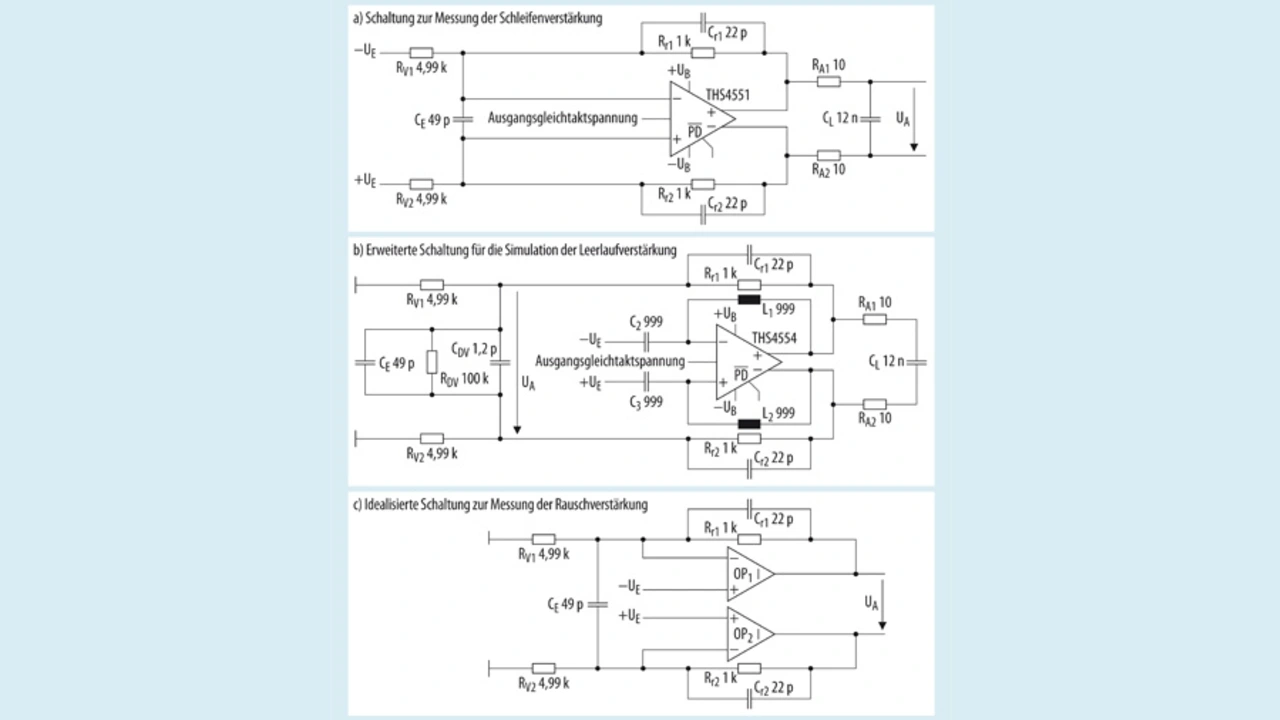 Dargestellt sind außerdem die Schaltung zur Simulation Schleifenverstärkung (Bild 5b) sowie die ideale Ersatzschaltung für die Rauschverstärkung (Bild 5c). Mit großen Induktivitäten und Kondensatoren an den Eingängen der Schaltung zum Messen der Schleifenverstärkung, lässt sich mit dem Simulator ein korrekter DC-Arbeitspunkt berechnen. Die Messschaltung für die Schleifenverstärkung erfordert eine zusätzliche diskrete Kondensator-Widerstands-Kombination an dem aufgetrennten Eingangspunkt, um die Eingangskapazität und den Eingangswiderstand des Verstärkers in die Schleife einzubeziehen.