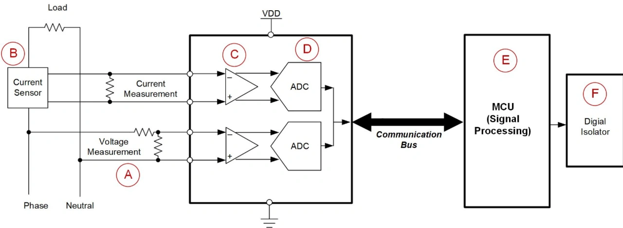 Bild 1 zeigt eine typische Signalkette einer Energiezähler-Applikation, der Übersicht halber nur für eine einzige Phase dargestellt. Ein A/D-Wandler (ADC) misst und digitalisiert gleichzeitig die Spannung und den Strom jeder Phase. Anschließend werden mithilfe der digitalen Signalverarbeitung Messgrößen wie Wirk- und Blindleistung, Wirk- und Bildenergie, verkettete Spannungen, Grundschwingungsleistung und -energie sowie Oberschwingungen extrahiert.