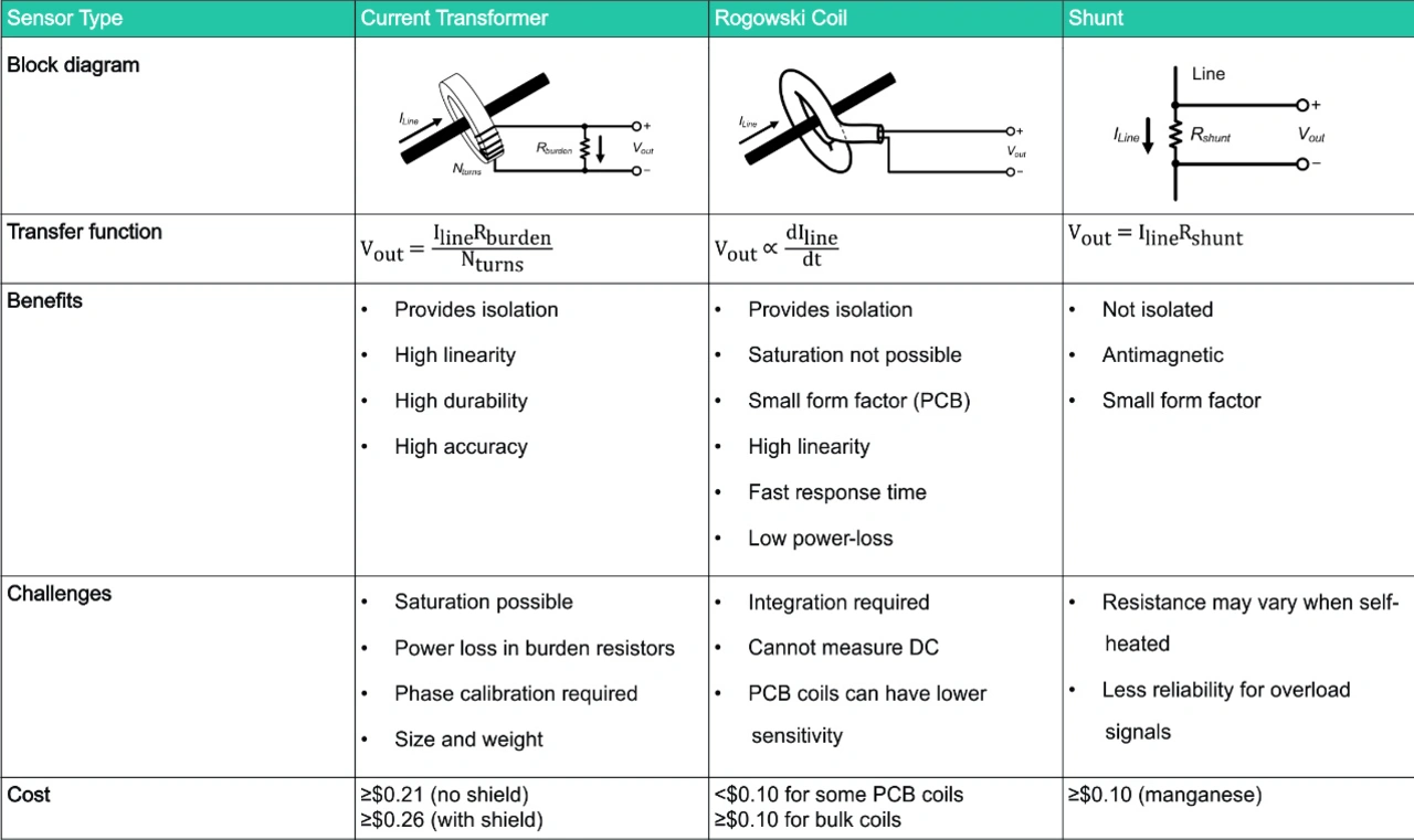 Tabelle 1 fasst die Performance-Vorteile, die Herausforderungen und die Kosten dreier Stromsensor-Technologien zusammen, die in Energiezähler-Anwendungen zum Einsatz kommen. Dass Stromwandler die beliebtesten Messwertaufnehmer sind, ist auf ihren großen Dynamikbereich, ihre Langlebigkeit und ihre geringe Einfügeimpedanz (Stichwort: nicht-invasive Strommessung) zurückzuführen. Allerdings dürften Stromwandler auch die teuerste aller Stromsensor-Technologien sein. Shunt-Widerstände hingegen sind aufgrund ihrer magnetischen Immunität, ihrer kleineren Abmessungen und ihres niedrigeren Preises überaus attraktiv, jedoch fehlt ihnen die galvanische Isolierung, und aufgrund der Eigenerwärmung büßen sie bei höheren Strömen an Genauigkeit ein.