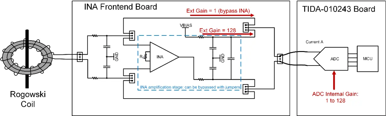 In Bild 2 ist die Messschaltung zu sehen, die für die Empfindlichkeits-Analyse verwendet wurde. Die Ausgangssignale der in Tabelle 3 aufgeführten Rogowski-Spulen werden an eine Signalaufbereitungs-Schnittstellenkarte geschickt, auf der die auf dem INA188 von TI basierende Verstärkerstufe bei Bedarf mit vier Jumpern umgangen werden kann. Der verstärkungsbestimmende Widerstand RG (siehe Bild 2) hat einen Wert von 390 Ω, was eine optionale externe Verstärkung um den Faktor 128 ergibt.
