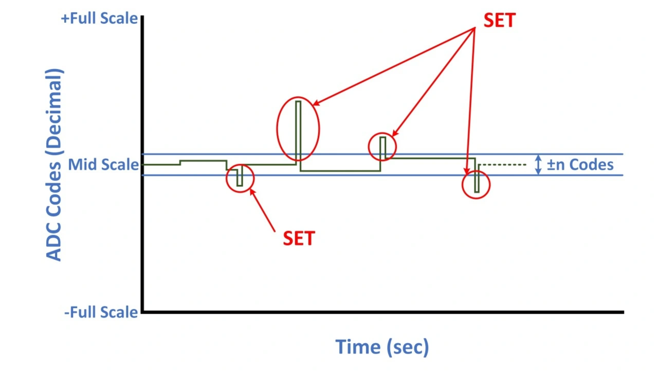 Vor einem SET-Testlauf sollte jedes Bauteil ohne Strahlung gemessen werden, um das passende SET-Fenster zu ermitteln. Das Fenster sollte so eingestellt werden, dass es sich gerade über dem charakteristischen Rauschpegel des ADCs und dem zusätzlichen Rauschen der Testumgebung befindet.