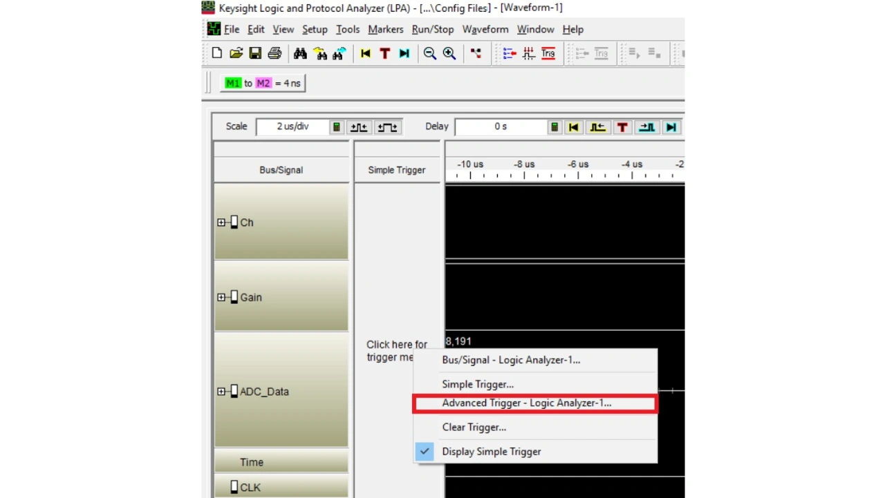 In den nachfolgenden Beispielen wird das Fenster auf ±8 Codes um den Mittelwert von 8200 eingestellt. Das Einstellen des ADC-Eingangs auf den Codemittelwert erlaubt die Beobachtung einer Abweichung der Transienten sowohl in positiver als auch negativer Richtung. Um den Logikanalysator richtig einzustellen, wird das Advanced Trigger Feature des Keysight 168161 Logikanalysators genutzt. Abbildung 2 zeigt, wie sich das Feature aufrufen lässt.