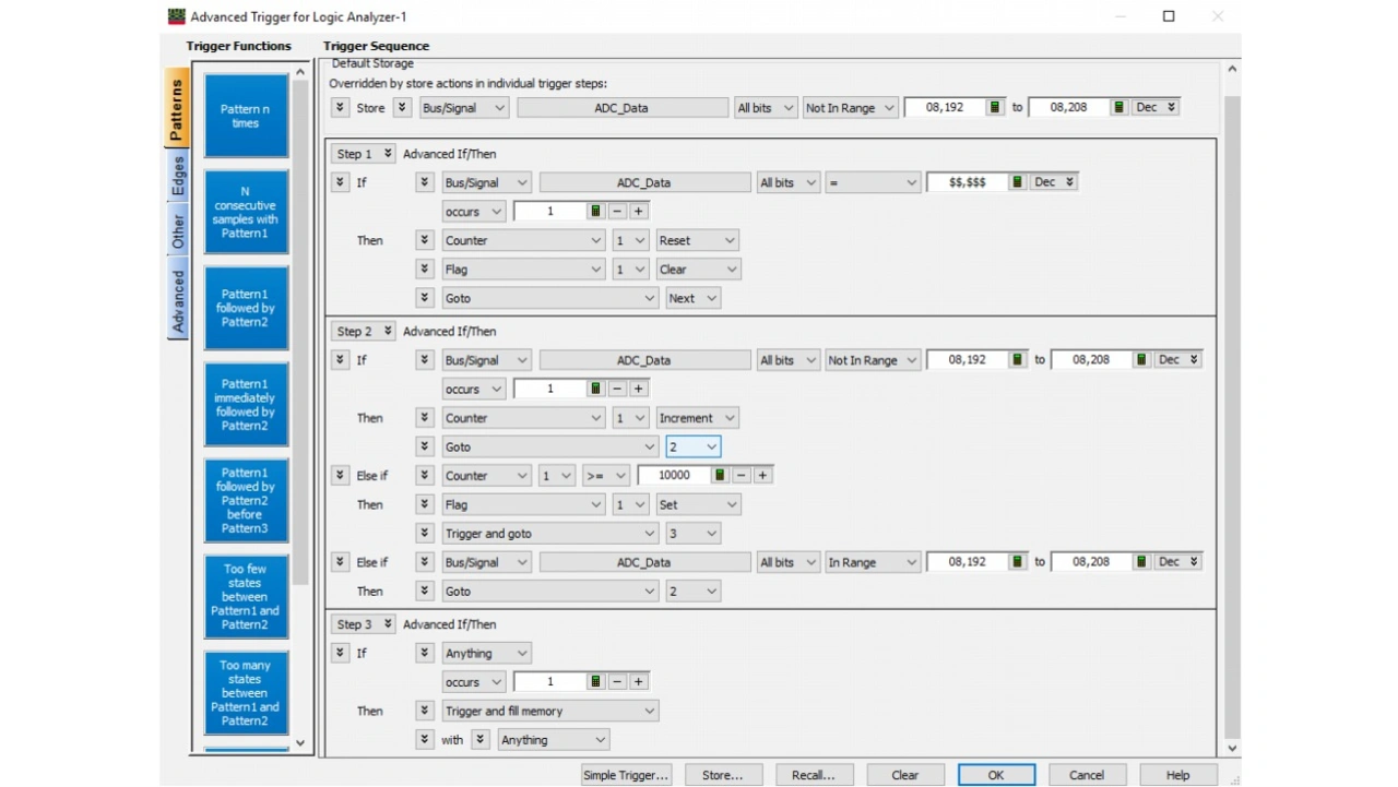 Wichtig ist anzumerken, dass jeder Schritt beim Advanced-Trigger-Betrieb einem Eingangstaktzyklus entspricht. Dies begrenzt die Verarbeitung der Abfragewerte im Logikanalysator auf eine einfache Detektion. Aber wie bereits erwähnt, kommt eine externe Software zur Nachbearbeitung der Daten zum Einsatz. Das Advanced-Trigger-Menü konfiguriert das Detektionsfenster. Wenn ein Abfragewert innerhalb des spezifizierten Bereichs liegt, wird es nicht gespeichert. Eine Zählfunktion kann auf die gewünschte maximale SET-Anzahl programmiert werden.