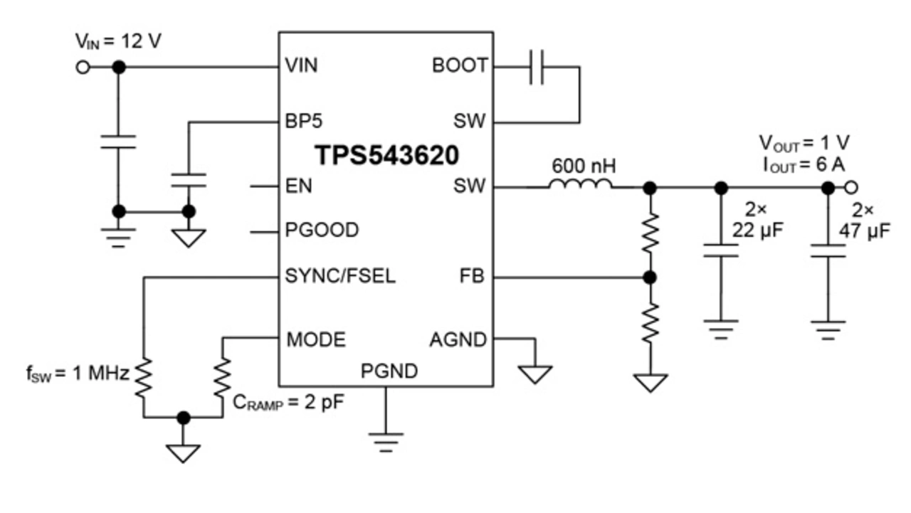 Um die verschiedenen Möglichkeiten zum Eindämmen der Welligkeit zu vergleichen, wurde das Evaluierungsmodul (EVM) des Abwärtswandlers TPS543620 herangezogen (Bild 2).