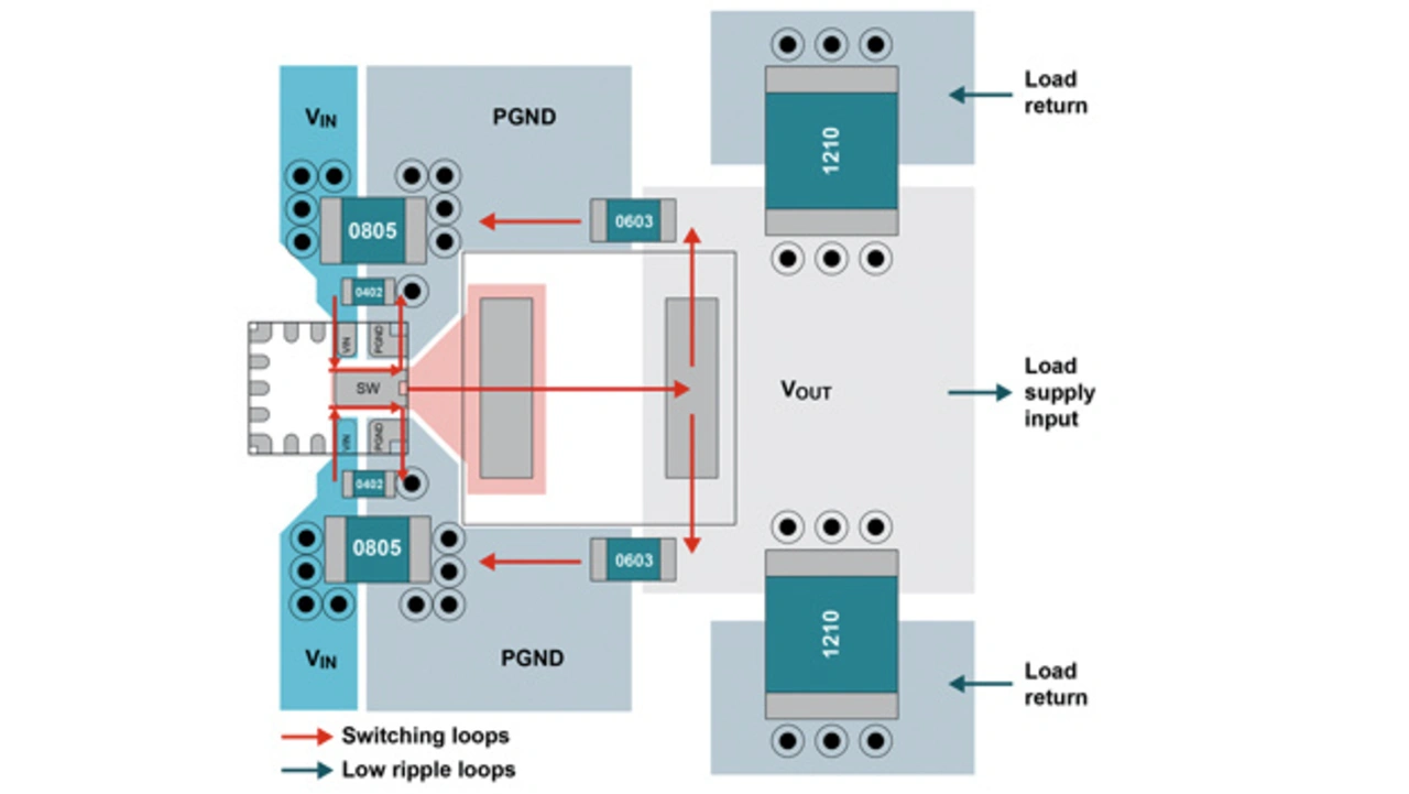 Eine zu hohe Ausgangswelligkeit kann auf ein mangelhaftes Layout zurückzuführen sein. Als Abhilfe kommt es zuallererst auf das Minimieren der parasitären Induktivität an, und zwar insbesondere bei jenen geschalteten Schleifen, die in Bild 5 mit Pfeilen gekennzeichnet sind. Dies vermindert ebenfalls die Spannungsbelastung der Leistungs-MOSFETs und dämmt die Störabstrahlungen ein.