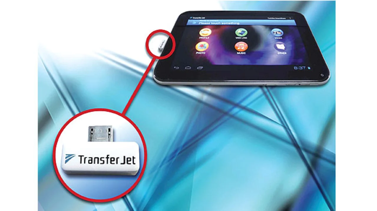 Dessen TJM35420MU (Bild 3) ist nun das erste TransferJet-microUSB-Adaptermodul, das ein HF-Transceiver-IC, einen Koppler, ein HF-Filter, passive Bauelemente und einen USB-Interface-Baustein enthält und das für Android-Smartphones und -Tablets gedacht ist: Die zu übertragende Datei wird auf dem Bildschirm des Geräts ausgewählt und dann automatisch auf das nebenan platzierte, empfangende Gerät übertragen. Das Interesse an TransferJet dürfte übrigens noch weiter steigen, wenn in Kombination damit weitere Datenübertragungsverfahren wie Digital Signage und auch Near-Field-Communication-Konzepte (NFC) hinzukommen. Das Verfahren soll, so Toshiba, künftig in Computer und Konsumelektronikgeräte unterschiedlicher Art integriert werden. Die Zukunft wird dies erweisen müssen.