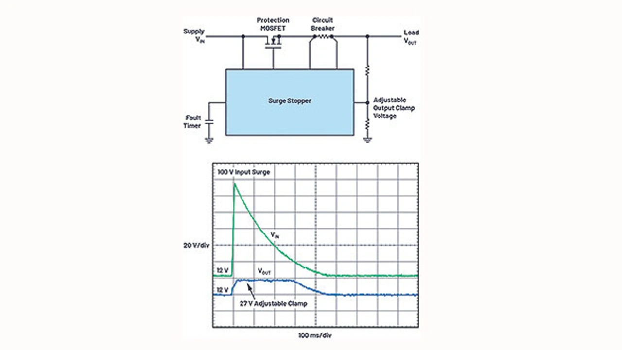 Bild 5 zeigt die vereinfachte Blockschaltung einer Überspannungsstopper-Implementierung zusammen mit den Ergebnissen einer eingangsseitigen 100-V-Spannungsspitze auf der nominalen 12-V-Schiene. Der Ausgang der Überspannungsstopper-Schaltung wird für die Dauer des Überspannungsereignisses auf 27 V geklemmt. Manche Überspannungsstopper überwachen auch Überströme mit einem seriellen Messwiderstand (Circuit Breaker in Bild 5) und passen das Gate des N-Kanal-FETs an, um den an die Ausgangslast abgegebenen Strom zu begrenzen.