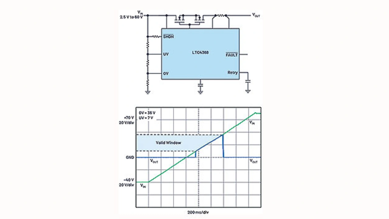 Anstatt jedoch die Ausgangsspannung zu klemmen oder zu regeln, schaltet der Schutzcontroller den Ausgang sofort ab, um die nachgeschaltete Elektronik zu schützen. Diese einfache Schutzschaltung braucht nur eine sehr kleine Fläche, und eignet sich somit für batteriebetriebene, portable Anwendungen. Der Schutzcontroller LTC4368 ist in einer vereinfachten Blockschaltung in Bild 6 dargestellt, zusammen mit seiner Reaktion auf Überspannung. Schutzcontroller gibt es in zahlreichen Varianten.