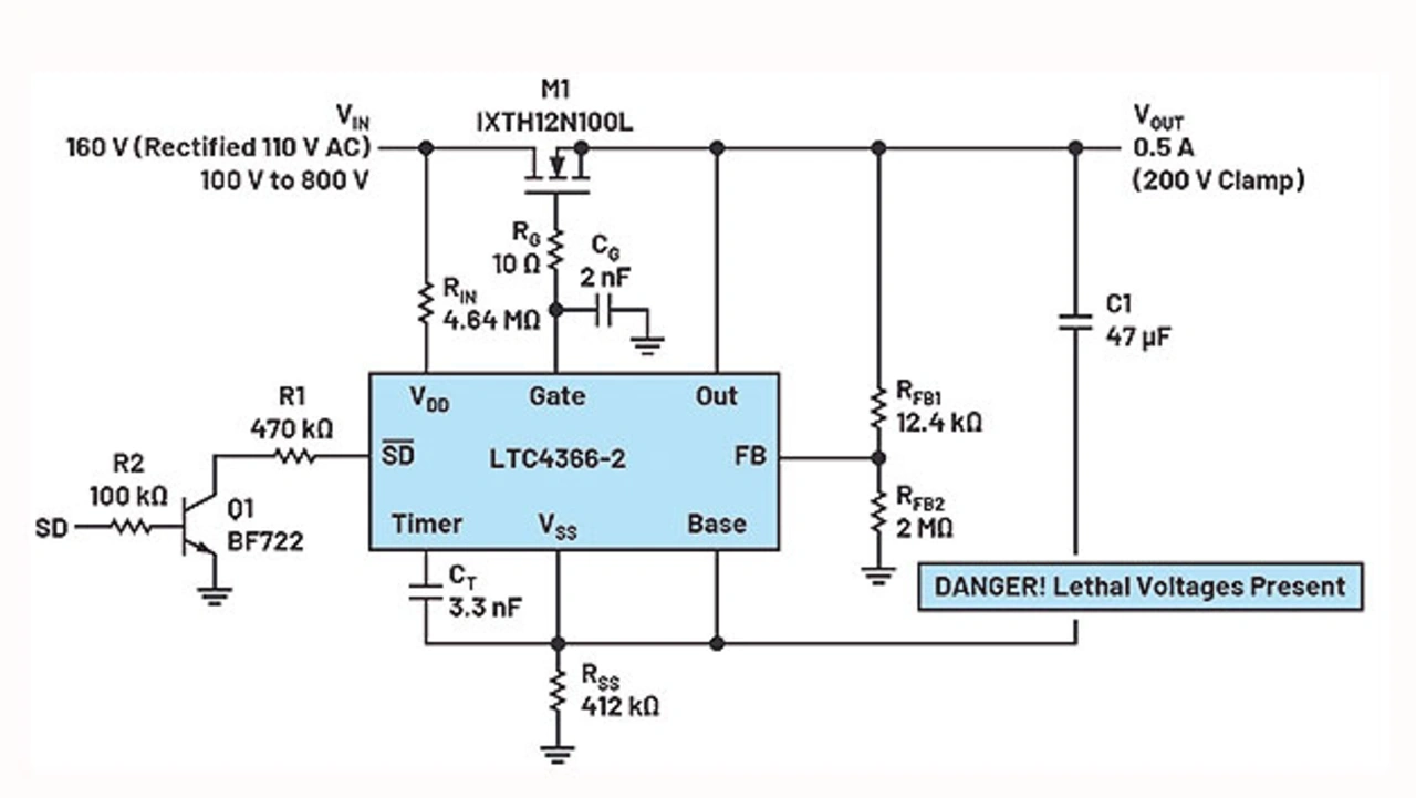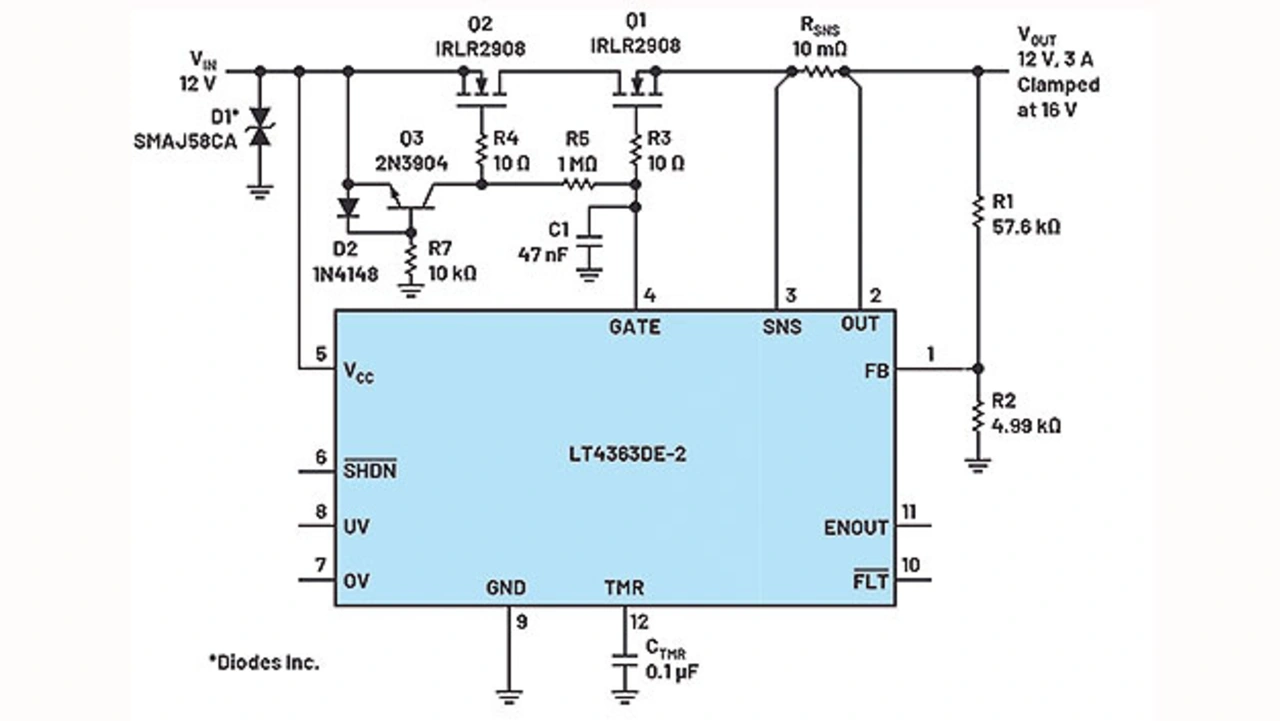 Das Ergebnis ist eine Eingangsspannungsbegrenzung, die durch die Spannungsfähigkeit der externen Bauteile und MOSFETs festgelegt wird. Bild 8 zeigt eine Schaltung, die mit einer sehr hohen DC-Versorgung arbeiten kann und gleichzeitig die nachgeschaltete Last schützt.