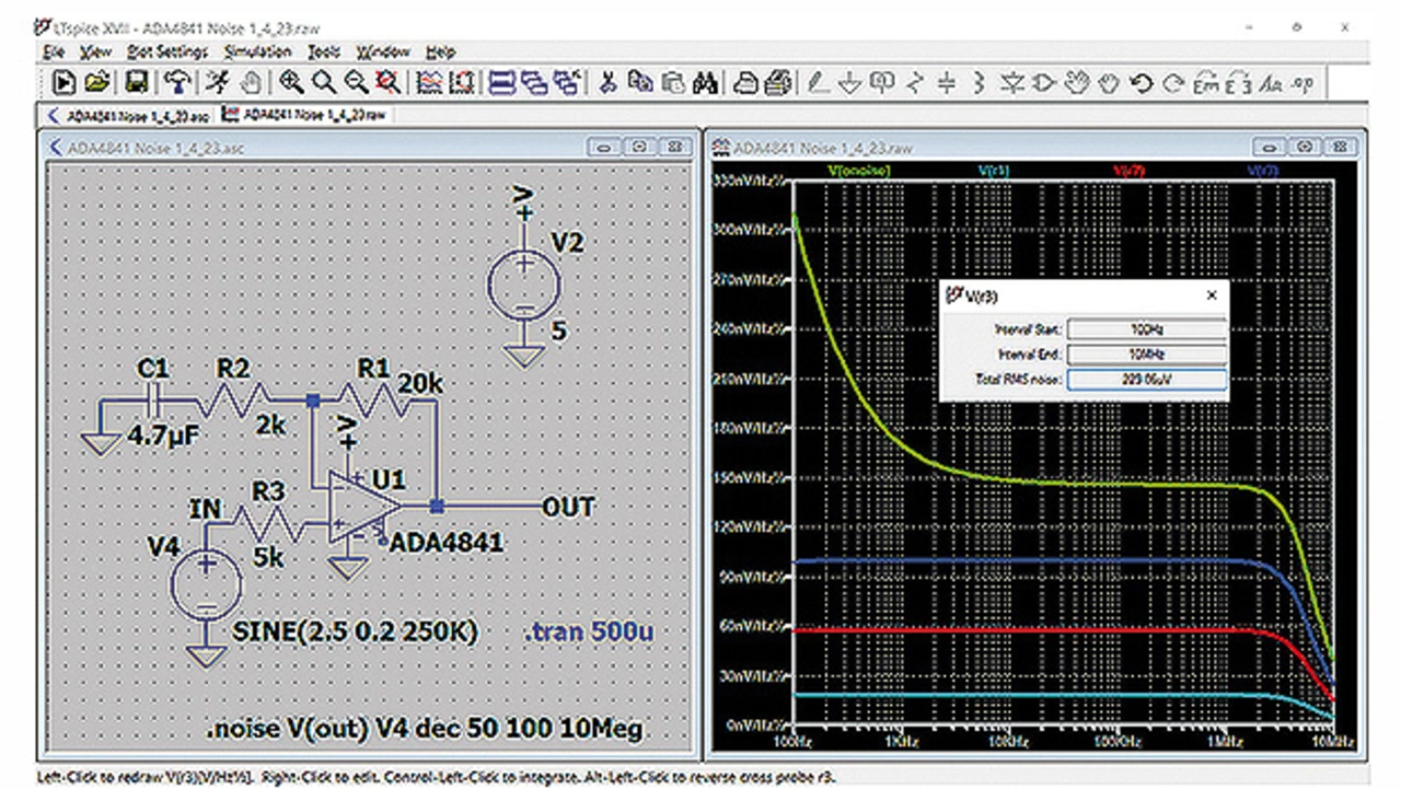Bild 1 zeigt eine Beispielsimulation, in der das Ausgangsrauschen und weitere Rauschanteile nebeneinander in einem Diagramm dargestellt sind, um die relative Bedeutung jeder dieser Anteile im Vergleich zum Nettoausgangs- rauchen einfach erkennen zu können. Zusätzlich ist es möglich, jede dieser Rauschdichtekurven zu integrieren, um den Einfluss über den gesamten Frequenzbereich zu sehen, wie am Beispiel der größten Rauschquelle R3 bei 100 nV/√Hz gezeigt ist.