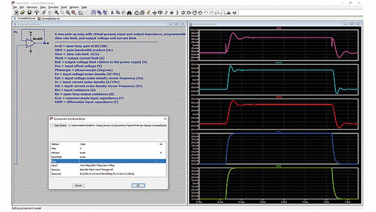 Bild 2 zeigt die Datei UniversalOpAmp.asc, die Teil jeder LTspice-Installation ist. Sie zeigt ein vereinfachtes OPV-Modell mit fünf Ebenen ansteigender Komplexität und umfasst simultan geplottet alle Ausgänge von der einfachsten bis zur komplexesten Version. Dies ist ein geeignetes Makromodell, das in jeden Entwurf einkopiert und einfach bearbeitet werden kann, um den Einfluss jedes Parameters zu studieren.