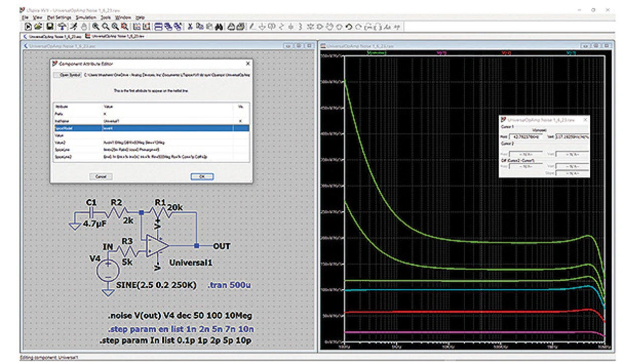 UniversalOpAmp kann in der Simulation ein leistungsstarkes Werkzeug zur Bestimmung des Rauscheinflusses des OPV-Bausteins sein. Mit diesem LTspice-Modell können Entwickler das Spannungsrauschen, Stromrauschen und die entsprechenden Eckfrequenzen jeder Rauschquelle einfach variieren, um das resultierende Ausgangs-/Eingangsrauschen und damit die Rauschtoleranz des Entwurfs zu ermitteln. Ein geeignetes Bauteil lässt sich anschließend leicht auswählen.