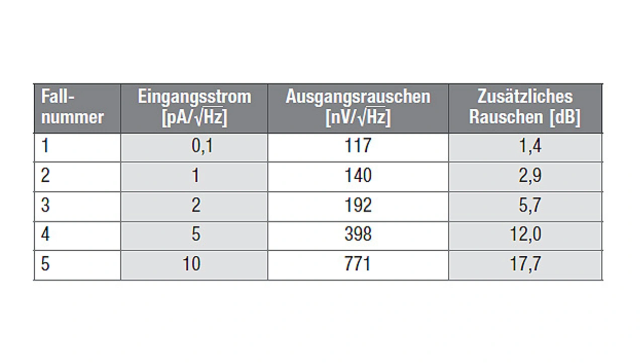 Tabelle 1 fasst die Simulationsergebnisse zusammen und stellt sie dem dominanten thermischen Rauschen (R3, 100 nV/√Hz) gegenüber. Das zusätzliche Rauschen für Fall 1 (0,1 pA/√Hz) ergibt sich z. B. aus der Formel.