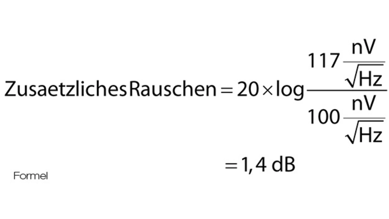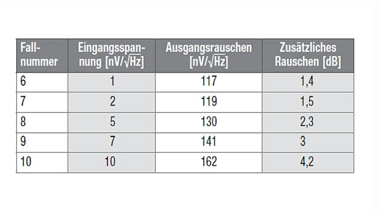 Beide Tabellen lassen den Schluss zu, dass das Eingangsstromrauschen bei <1 pA/√Hz und das Eingangsspannungsrauschen bei <7 nV/√Hz liegen müssen, wenn das zusätzliche Rauschen nicht über 3 dB steigen soll.