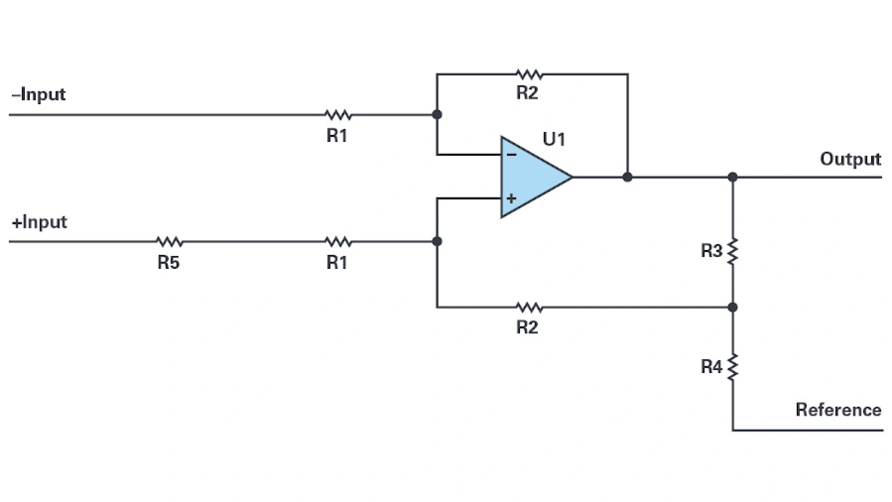 Ein Hauptmerkmal eines Differenzverstärkers ist das Gleichtaktunterdrückungsverhältnis (CMRR). Angepasste Widerstandsverhältnisse im positiven und negativen Pfad sind für ein gutes CMRR von entscheidender Bedeutung, daher sollte auch ein Widerstand (R5) in Reihe mit dem positiven Eingangswiderstand geschaltet werden, um den zusätzlichen Widerstand am Referenzanschluss auszugleichen.