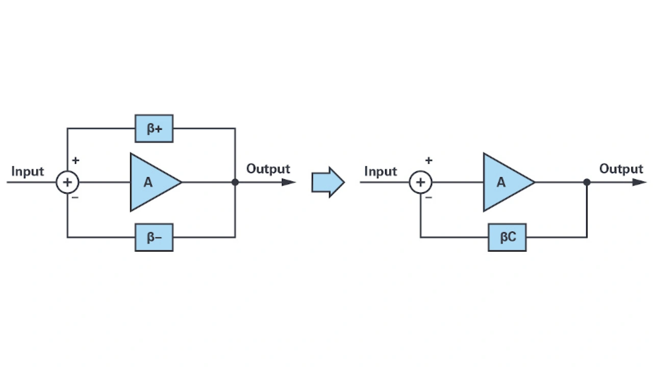 Durch Rückkopplung vom Ausgang auf den Referenz-Anschluss eines Differenzverstärkers und damit auf den nichtinvertierenden Eingang, kann die Verstärkung des intern mit fester Verstärkung ausgestatteten Verstärkers erhöht werden (Bild 2). Der daraus resultierende kombinierte Wert für β (βc) für den Operationsverstärker ist die Differenz zwischen β- und β+, die nun die Verstärkung und Bandbreite bestimmt. Da β+ eine positive Rückkopplung liefert, ist zu beachten, dass die Gesamtrückkopplung negativ bleibt (β– > β+).