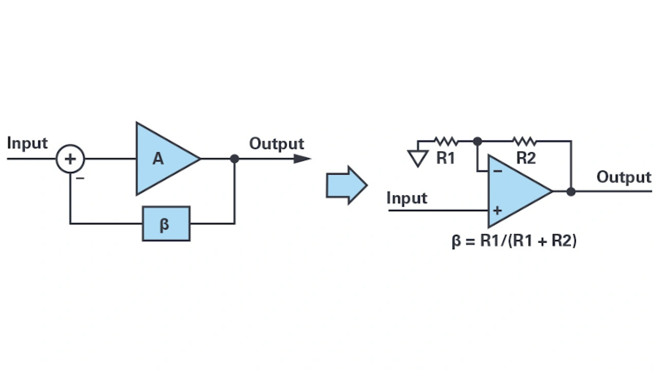 In einer Verstärkerschaltung mit negativer Rückkopplung (Bild 1) wird der Teil des Ausgangssignals, der zum invertierenden Eingang rückgekoppelt wird, als β bezeichnet, wobei die Verstärkung der Schaltung 1/β beträgt. Bei β = 1 wird das gesamte Ausgangssignal zum invertierenden Eingang zurückgeführt und so ein Puffer mit Verstärkung Eins realisiert. Mit einem niedrigeren Wert für β wird eine höhere Verstärkung erreicht.