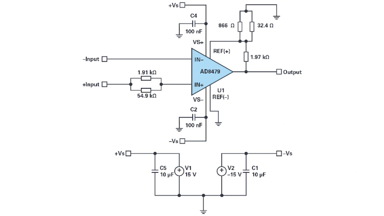 Der Differenzverstärker AD8479 [1] von Analog Devices verwendet diese fortschrittliche Technik. Er ist ein Differenzverstärker mit Verstärkung Eins und hoher Gleichtaktunterdrückung. Mit dem AD8479 kann ein Differenzsignal auch bei einem Gleichtaktsignal von ±600 V gemessen werden. Für einige Anwendungen ist eine Verstärkung größer als Eins erforderlich, und die zuvor beschriebene Technik ist auch dafür perfekt geeignet. Im folgenden Rechenbeispiel wird die für die Strommessung per Messwiderstand häufig gewünschte Verstärkung von 10 (= V1) gewählt.