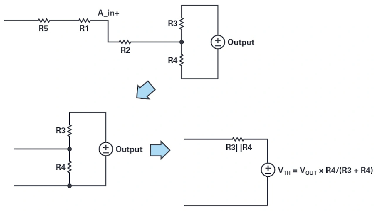 Um die erforderlichen Werte der Widerstände R3 und R4 zu bestimmen, kann zur Vereinfachung ein Thévenin-Ersatzschaltbild verwendet werden (Bild 4).