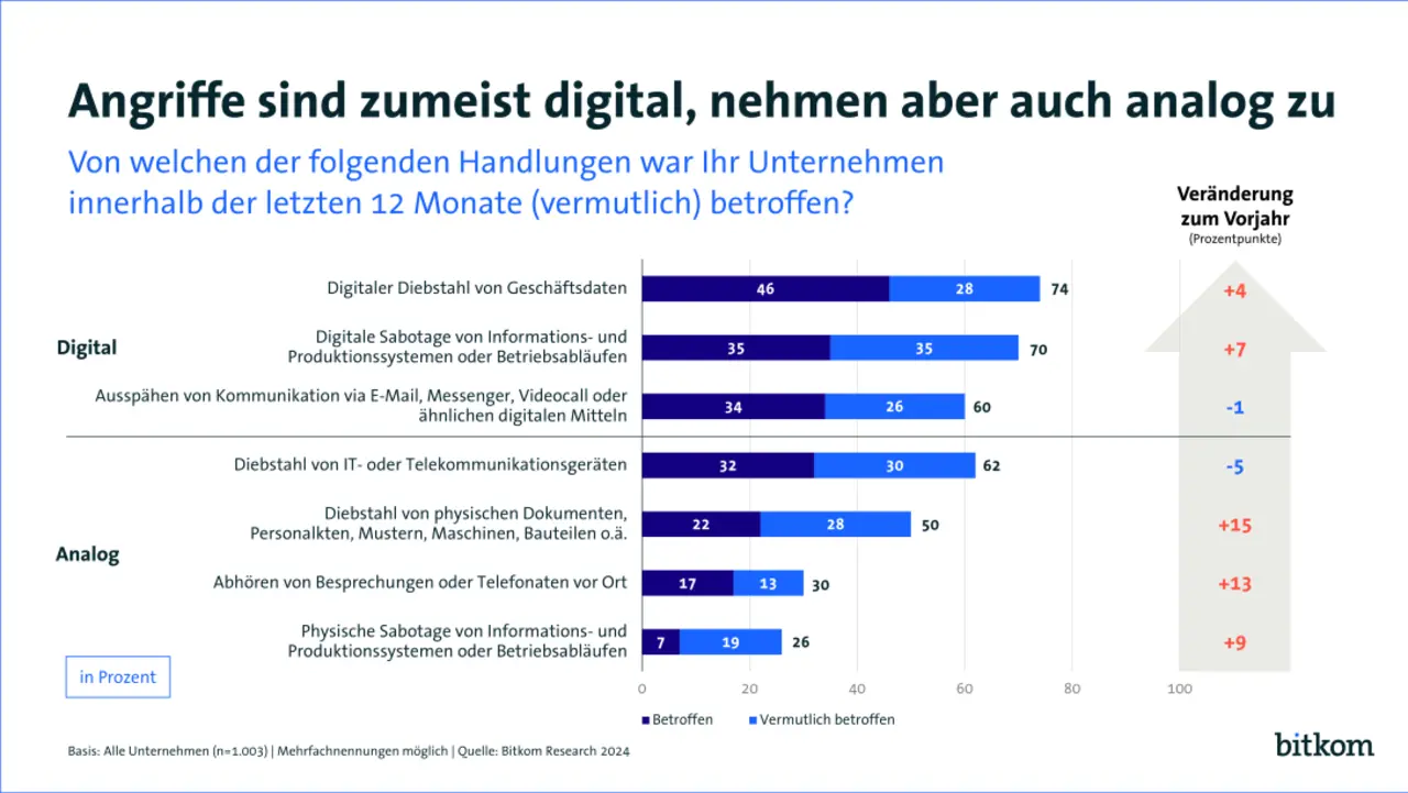 Nachdem sich bereits im vergangenen Jahr ein deutlicher Trend hin zu digitalen Angriffen auf die deutsche Wirtschaft gezeigt hatte, nehmen digitale Attacken 2024 nochmals zu. Zugleich steigen aber auch klassische analoge Angriffe. So waren 74 Prozent der Unternehmen von digitalem Ausspähen von Geschäftsdaten betroffen oder vermutlich betroffen, ein Plus von 4 Prozentpunkten im Vergleich zum Vorjahr. Dabei berichten die von Datendiebstahl betroffenen Unternehmen deutlich häufiger, dass Kundendaten (62 Prozent, plus 6 Prozentpunkte), Zugangsdaten oder Passwörter (35 Prozent, plus 12 Prozentpunkte) sowie geistiges Eigentum wie Patente und Informationen aus Forschung und Entwicklung (26 Prozent, plus 9 Prozentpunkte) entwendet wurden. Am häufigsten sind weiterhin auch allgemeine Kommunikationsdaten wie E-Mails betroffen (63 Prozent, plus 1 Prozentpunkt). Seltener geht es um Finanzdaten (19 Prozent, minus 1 Prozentpunkt) sowie Daten von Mitarbeiterinnen und Mitarbeitern (16 Prozent, minus 17 Prozentpunkte). 70 Prozent der Unternehmen berichten von digitaler Sabotage von Systemen oder Betriebsabläufen (plus 7 Prozentpunkte), 60 Prozent vom Ausspähen digitaler Kommunikation, etwa E-Mails, Messenger oder Videocalls (minus 1 Prozentpunkt).