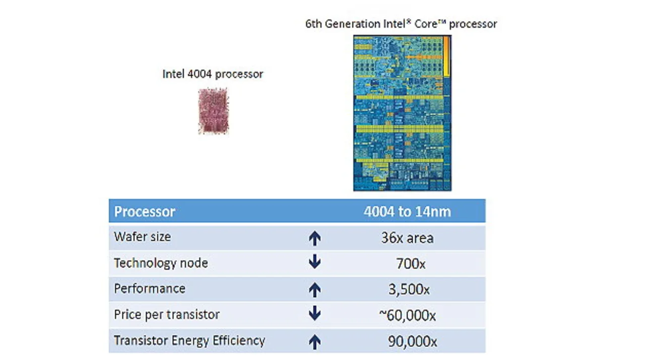 Aus Holts Sicht wird die Skalierung auch in Zukunft Vorteile bringen und zwar in allen drei Bereichen: höhere Geschwindigkeit, geringere Leistungsaufnahme und niedrigere Kosten pro Transistor. Ein Vergleich zwischen dem 4004 und dem Intel Core i5 mit 14 nm zeigt, welche Fortschritte in diesen drei Bereichen in den letzten gut 40 Jahren möglich waren: Die Geschwindigkeit ist um den Faktor 3500 gestiegen, die Energieeffizienz um den Faktor 90.000 und die Kosten pro Transistor um den Faktor 60.000 gesunken.