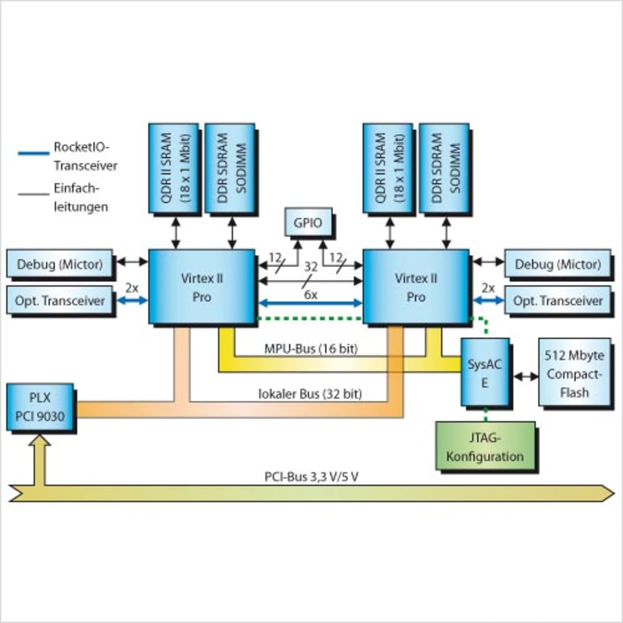 Ziel dieser Hardware-Entwicklung war der Entwurf einer FPGA-Plattform, welche durch schnelle, serielle Vernetzung zu Netzwerken beliebiger Größe skaliert werden kann (Bild 1). Den Kern bilden zwei FPGAs der Xilinx-Virtex-II-Pro-Familie (XC2VP30), welche auf einem 32-bit-PCI-Trägerboard [2] platziert sind. Der PCI-Bus dient einerseits zur Energieversorgung und andererseits zur Anbindung der Karte an einen PC-Host. Der Brückenbaustein PCI9030 von PLX Technology [3] setzt die PCI-Signale auf eine einfache lokale Busschnittstelle um, so dass im Vergleich mit einer direkten FPGA-Ankopplung an den PCIBus weniger Logikzellen benötigt werden.