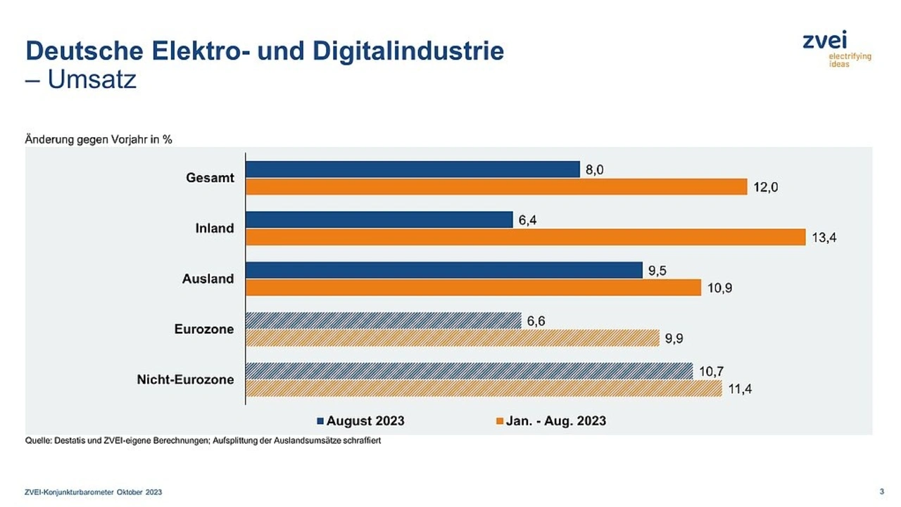 Der nominale Umsatz in der deutschen Elektro- und Digitalindustrie rückte im August 2023 um 8,0 Prozent gegenüber Vorjahr auf 20,6 Mrd. Euro vor. Dabei erhöhten sich die Inlandserlöse um 6,4 Prozent auf 9,6 Mrd. Euro. Beim Auslandsumsatz belief sich das Plus auf 9,5 Prozent (11,0 Mrd. Euro). Die Erlöse mit Geschäftspartnern aus dem Euroraum wuchsen um 6,6 Prozent auf 3,5 Mrd. Euro. Der Umsatz mit Drittländern legte fast doppelt so stark zu (+ 10,7 Prozent auf 7,5 Mrd. Euro).