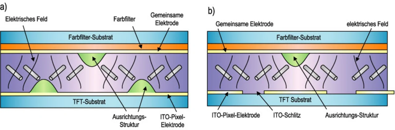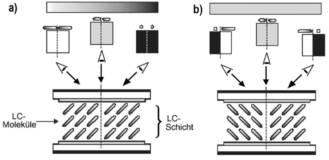 Mit MVA-Flüssigkristallen bedient man sich einer als „VA-Mode“ bezeichneten Betriebsart. Diese ist den übrigen LCD-Betriebsarten hinsichtlich des Kontrasts deutlich überlegen, solange das Display von vorn betrachtet wird. Sobald der Blick jedoch in einem Winkel auf das Display fällt, ergeben sich keine nennenswerten Verbesserungen. Als besonders schwierig erweist sich die Wiedergabe von grau skalierten Bildern unter verschiedenen Betrachtungswinkeln. Die Gründe hierfür werden in Bild 1 deutlich.