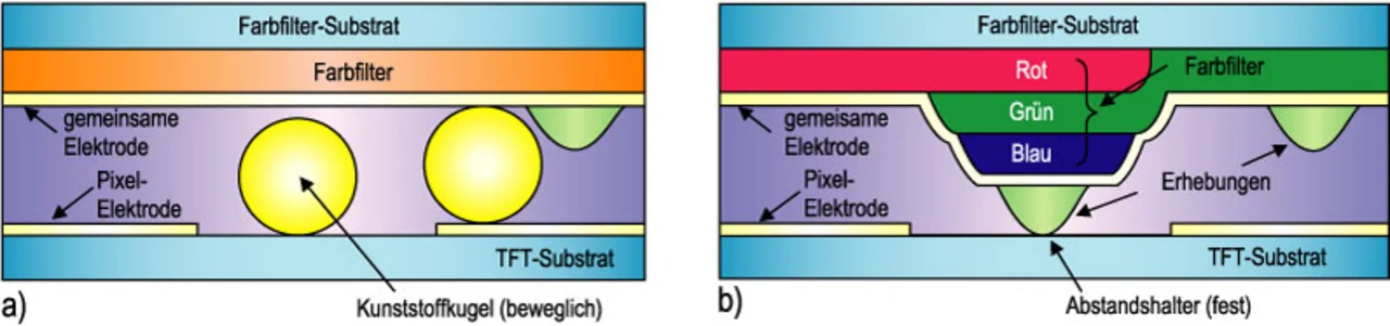Die konventionelle Methode zur Herstellung dieses Abstands besteht darin, Kunststoffkügelchen zwischen beiden Schichten zu verteilen (Bild 4a). Die als Abstandshalter fungierenden Erhebungen werden im ADF-Verfahren gemeinsam mit den Erhebungen hergestellt. Bild 4b zeigt das neu konstruierte „Columnar-Spacer-Panel“. Hier sind die aus Kunstharz bestehenden Filter für Rot, Grün und Blau lediglich in den Randbereichen der Pixel übereinander angeordnet, um das Durchtreten von Lichtstrahlen aus den Randzonen zu minimieren (übereinander angeordnete RGB-Filter lassen kein Licht durch). Die bei gegenwärti-gen Fertigungsprozessen erforderliche Schwarzmatrix (eine das gesamte Pixel abdeckende Schicht), die den Durchtritt von Licht unterbindet, kann dadurch entfallen. Auf den übereinandergeschichteten Farbfiltern wird zusätzlich eine Erhebung angebracht, die als Abstandshalter fungiert und für eine definierte Distanz zwischen dem TFT-Substrat und dem Farbfilter-Substrat sorgt.