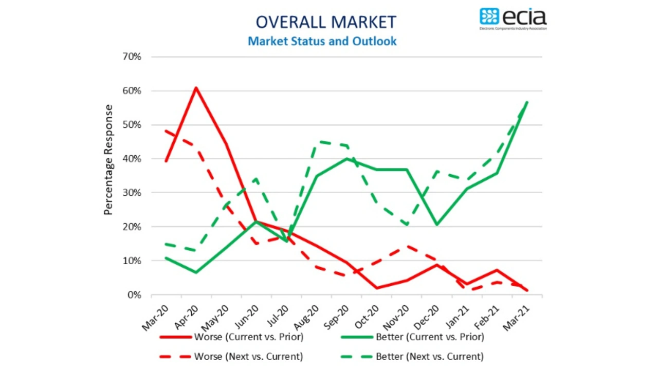 Das Geschäftsklima am Markt für Elektronikkomponenten hat sich rasant verbessert, wie die monatliche »Electronic Component Sales Trend« der ECIA belegt. Der ECST-Index stieg von Februar auf März 2021 von 132 auf 158 Punkte. Trotzdem bleibt die Lieferkette angespannt.