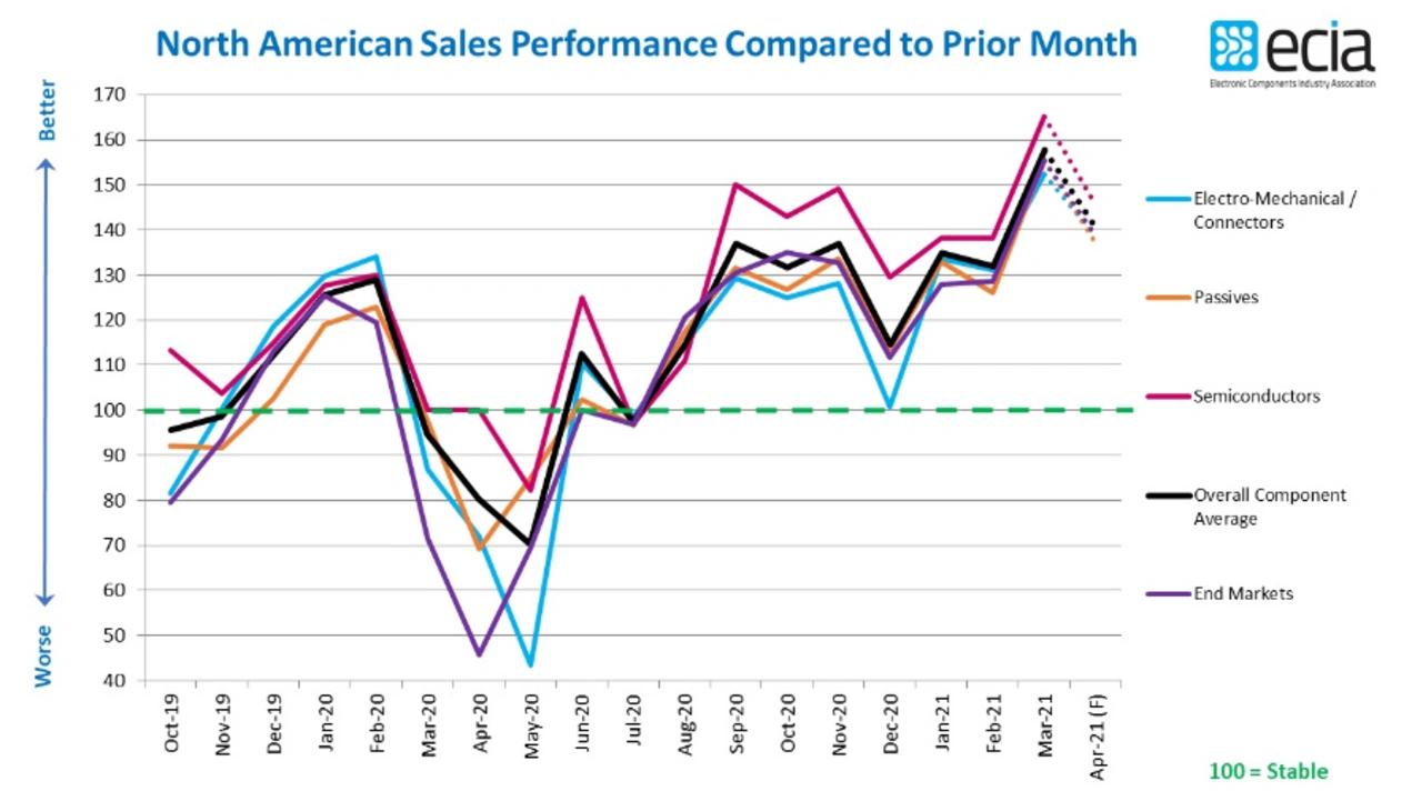 Die Umfrage der Electronic Components Industry Association (ECIA), die das monatliche Umsatzwachstum bewertet, stieg von Februar auf März um 26 bis 27 Punkte für Bauelemente und Endmärkte. Wie in Bild 1 zu sehen ist, stieg der durchschnittliche Gesamtwert für Komponenten im März auf 158 Punkte im Vergleich zu 132 Punkten im Februar.