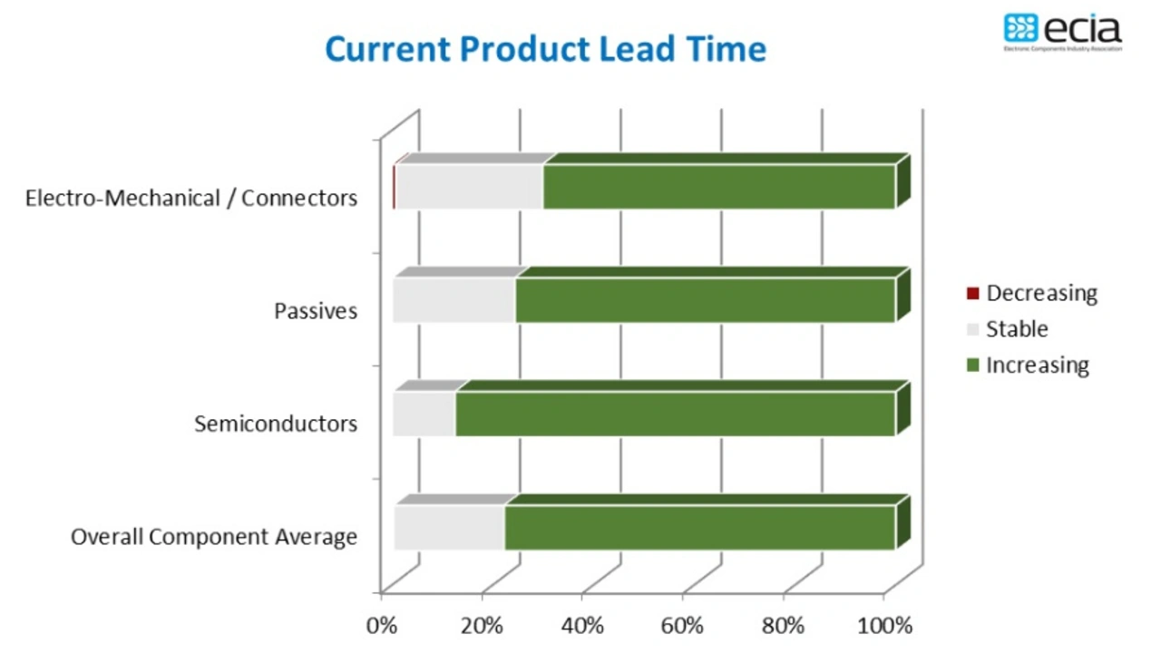 Dieser Effekt wird durch den sogenannten Bullwhip-Effekt verstärkt, da sich die erhöhte Nachfrage auf dem Endmarkt in der Lieferkette bemerkbar macht. Die Unternehmen arbeiten mit Hochdruck daran, ihre Lagerbestände aufzufüllen und sich auf zukünftiges Wachstum vorzubereiten. Die ECST-Umfrage misst auch den Anstieg der Lieferzeiten, was weitere von der ECIA veröffentlichte Daten zu Lieferzeiten untermauert. Das Diagramm, das die Lieferzeiten darstellt, unterstreicht, wie stark der Druck auf die Lieferzeiten zunimmt, was sich auch in einem stark steigenden Preisdruck niederschlägt (Bild 3).